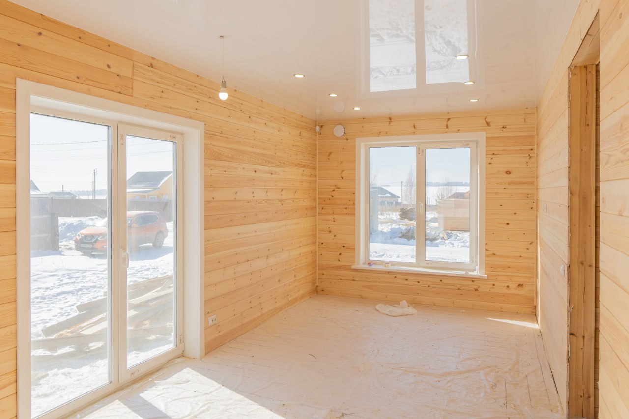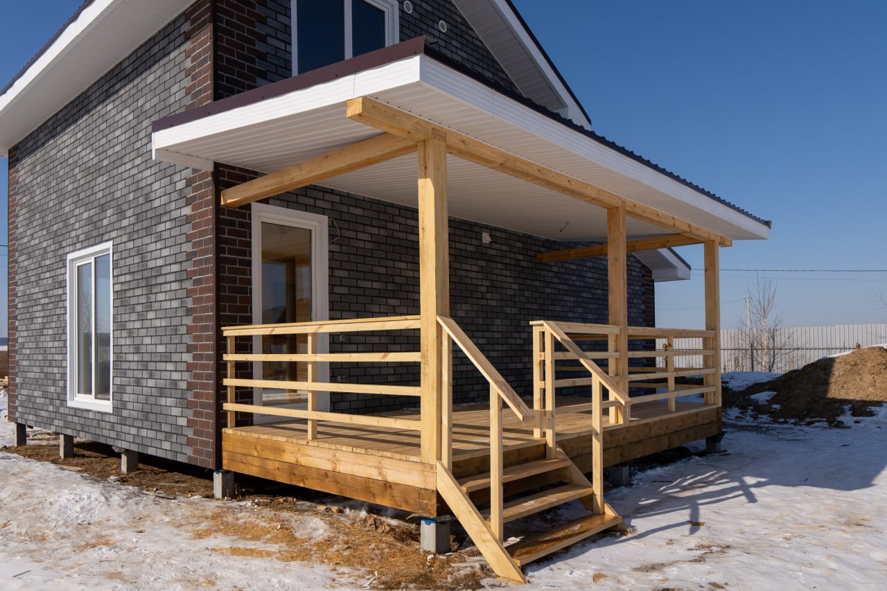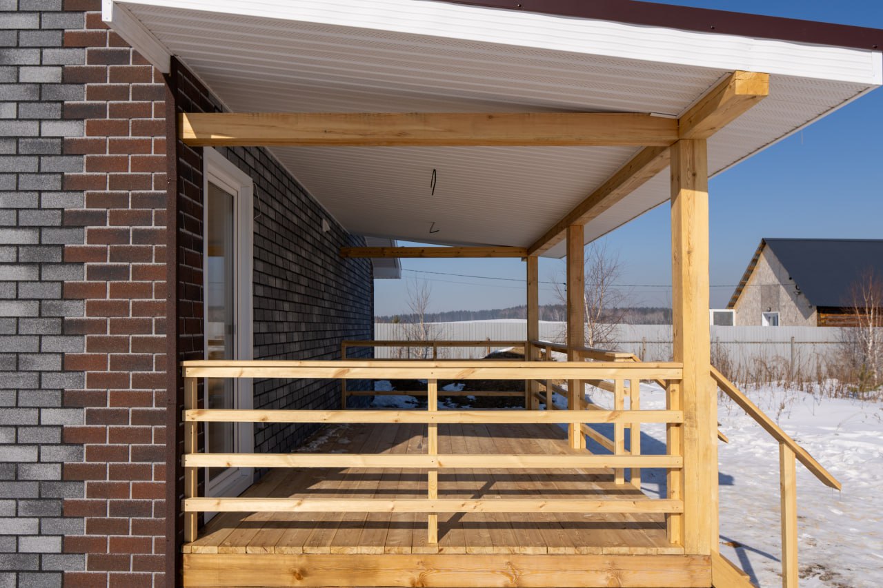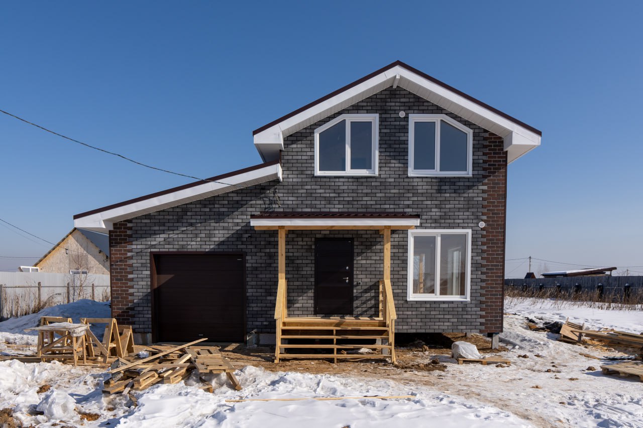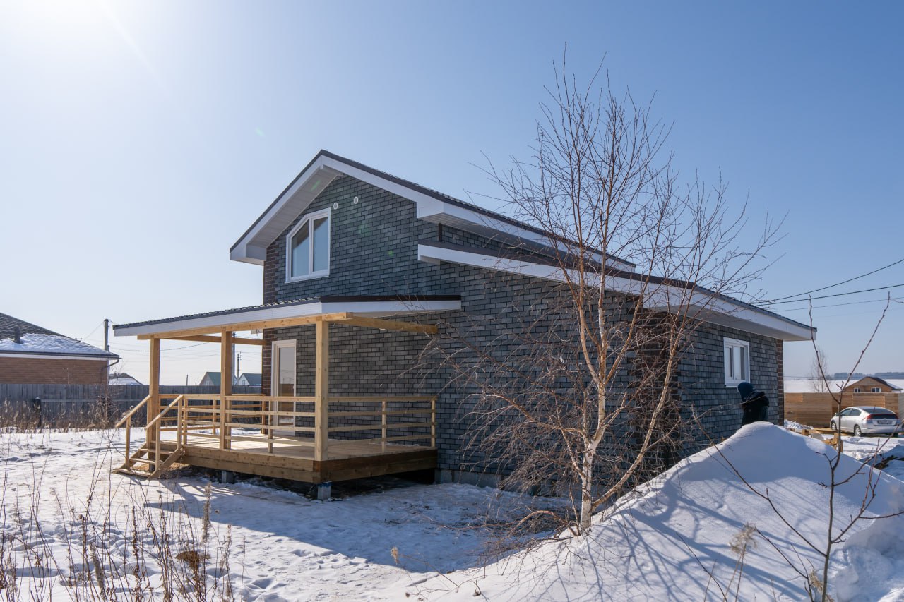 Зимой особенно чувствуется, что этот дом тёплый. Все примыкания и свесы сделаны аккуратно, нигде не «сифонит», внутри тоже уже выполнена отделка. В общем, заезжай – и живи.