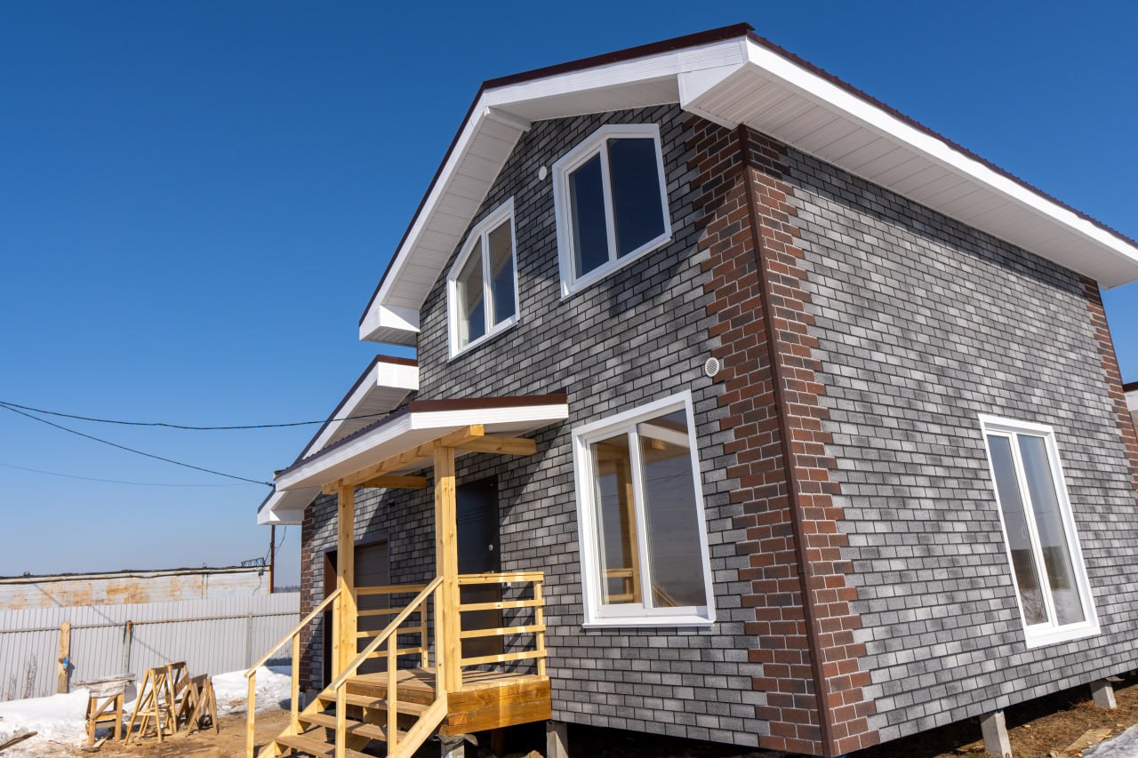 ✔ И фасад, который будто кирпичный, но на самом деле выполнен из битумной плитки с декоративной вырезкой по углам.